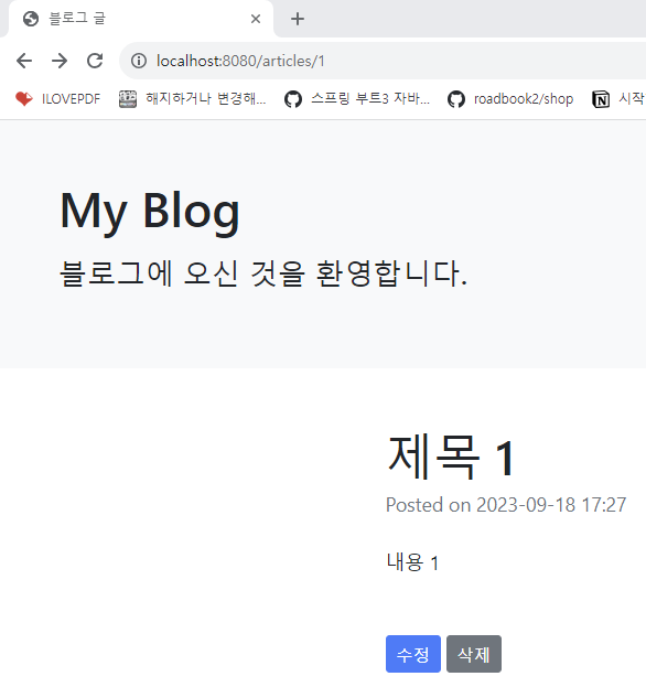 - 또한 뷰에선 쿼리 파라미터의 id 여부에 따라 [수정]과 [생성] 중 적절한 버튼을 보여줘야 한다.