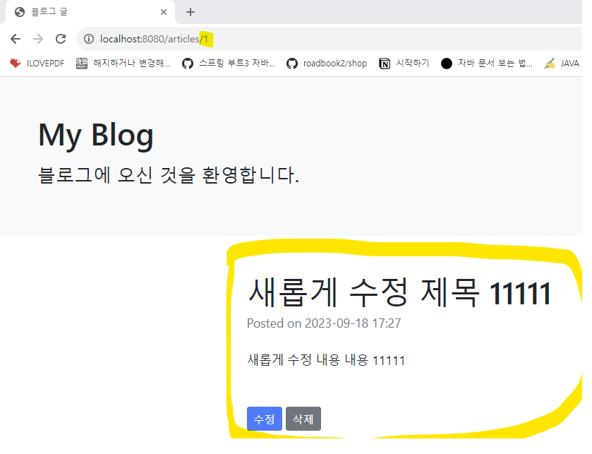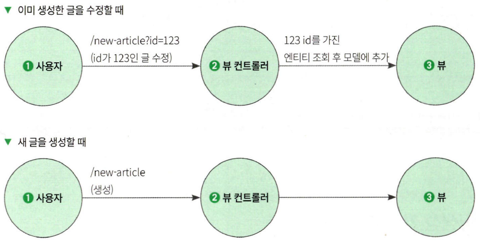 - 즉, 쿼리 파라미터가 있는 경우 컨트롤러 메서드는 수정을 해야 하므로 엔티티를 조회하여 기존 글 데이터를 모델에 넣어 화면에 보여줘야 한다.