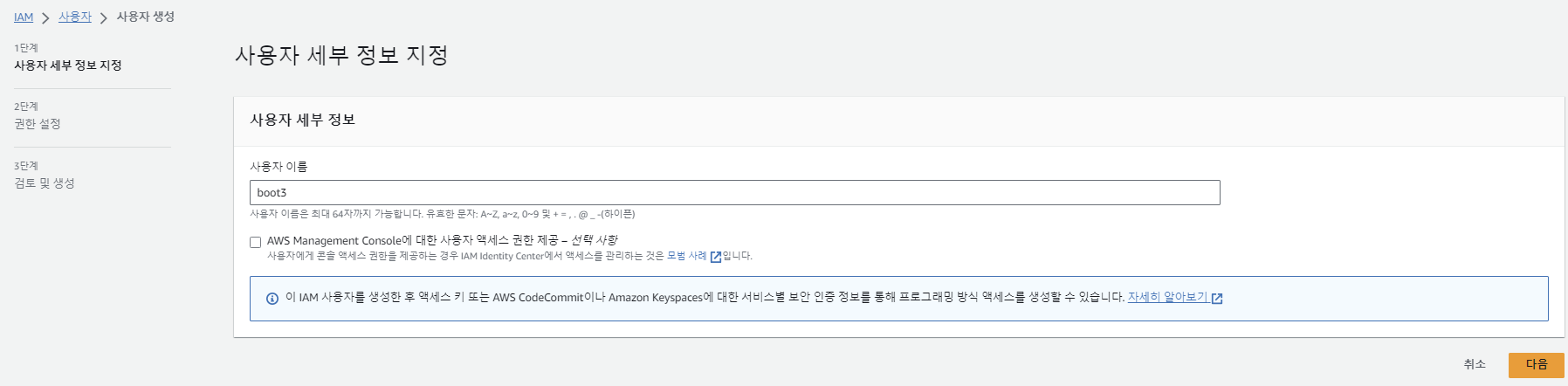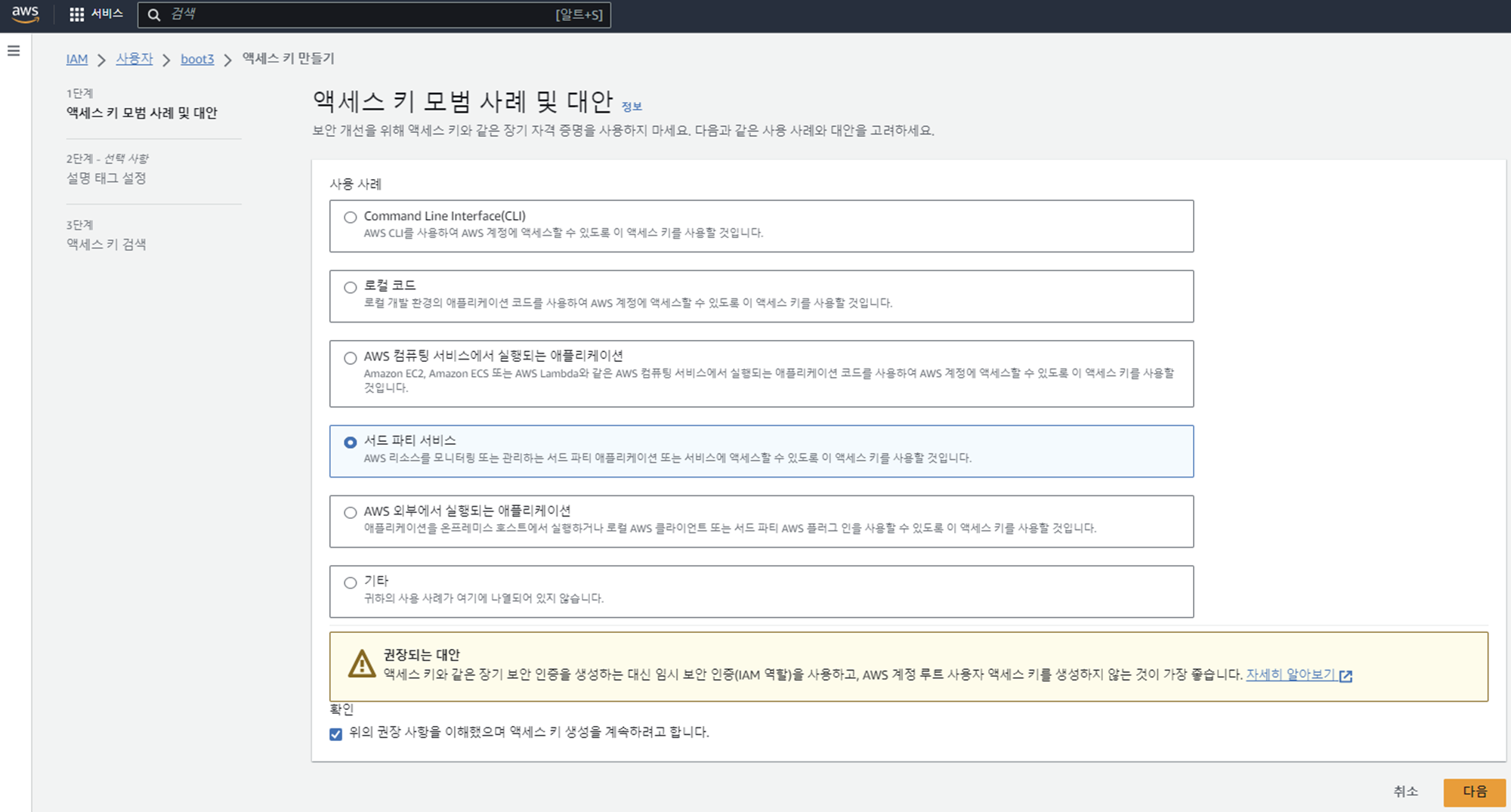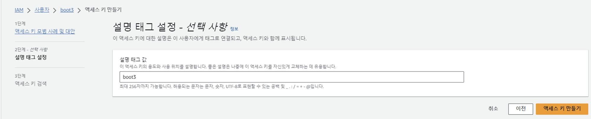 생성된 boot3을 클릭하여 [액세스 키 생성] 버튼 클릭 후 작업 시작