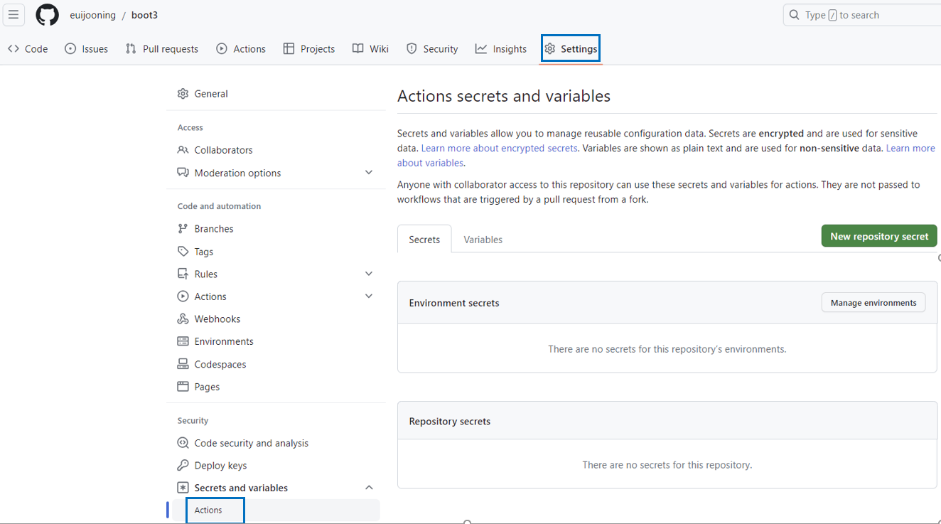 github 에 접속 후 Settings -> Secrets and Variables -> Actions 순서로 클릭