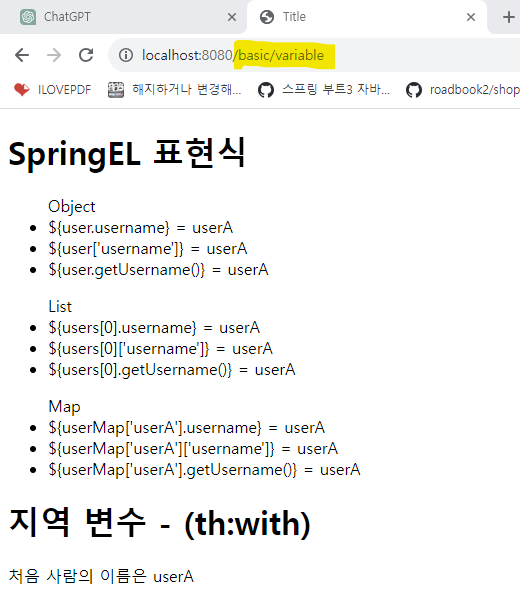 - ${userMap['userA']['username']}와 ${userMap['userA'].getUsername()}도 마찬가지로 userMap 맵에서 "userA" 키의 username 값을 출력하는 방식이 다릅니다.