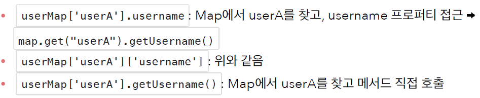 - ${userMap['userA']['username']}와 ${userMap['userA'].getUsername()}도 마찬가지로 userMap 맵에서 "userA" 키의 username 값을 출력하는 방식이 다릅니다.
