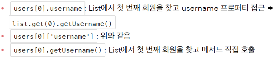 - ${users[0]['username']}와 ${users[0].getUsername()}도 마찬가지로 users 리스트의 첫 번째 요소의 username 값을 출력하는 방식이 다릅니다.