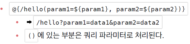 - "hello query param" 텍스트로 표시되는 하이퍼링크를 생성하며, 쿼리 매개변수 param1과 param2를 포함한 "/hello" URL을 생성한다.