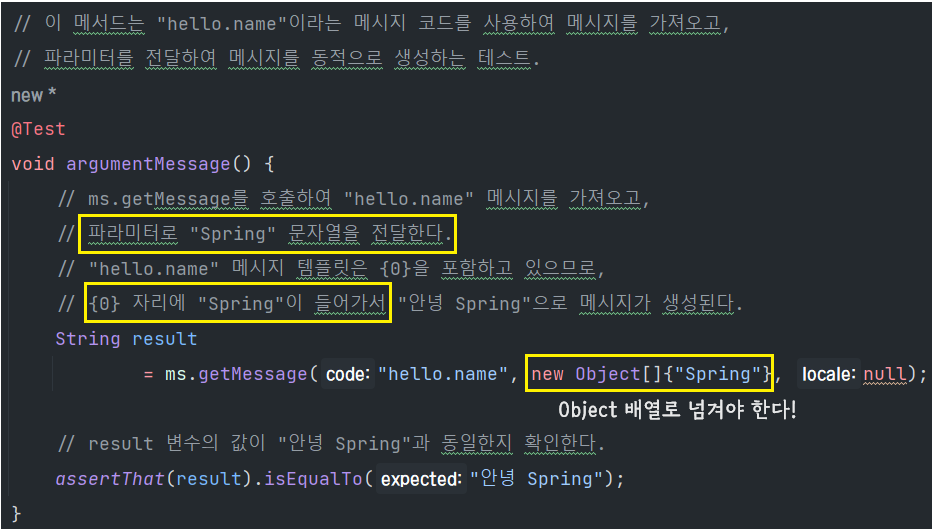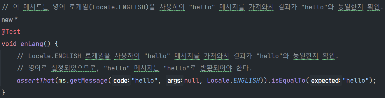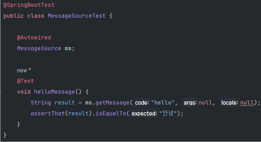assertThat(ms.getMessage("hello", null, Locale.KOREA)).isEqualTo("안녕");