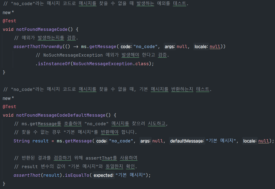이 두 테스트는 예외 처리와 기본 메시지 반환 동작이 정확하게 동작하는지 확인하는 데 사용된다.