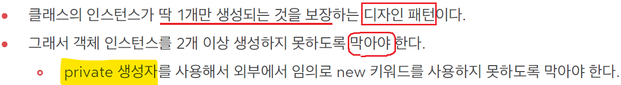 //3. 생성자를 private으로 선언해서 외부에서 new 키워드를 사용한 객체 생성을 못하게 막는다.