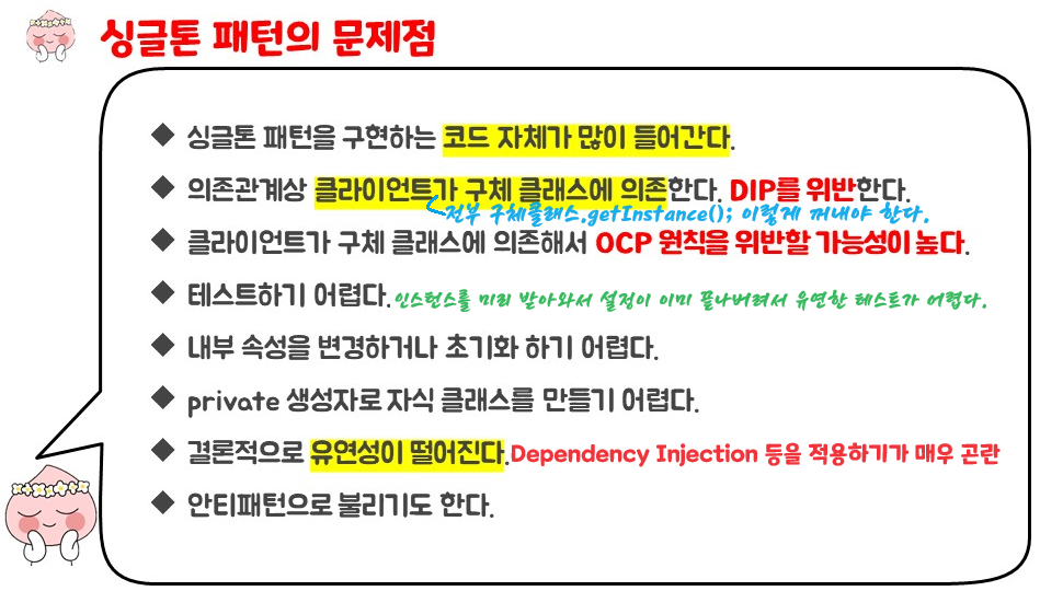 하지만 싱글톤 패턴은 다음과 같은 수 많은 문제점들을 가지고 있다.