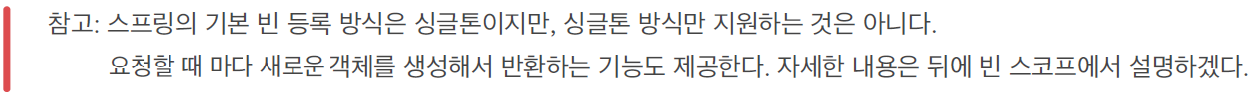 지금까지 여기서 다뤄왔던 스프링 빈이 바로 싱글톤으로 관리되는 빈이다.