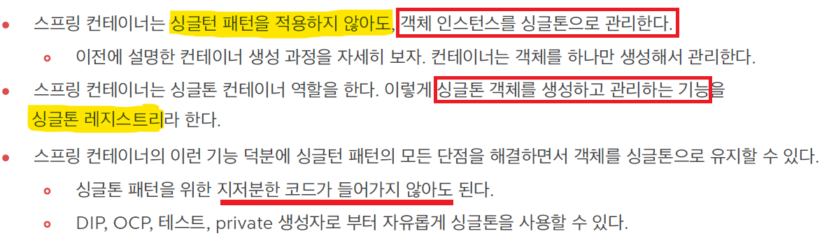 스프링 컨테이너는 싱글톤 패턴의 문제점을 해결하면서, 객체 인스턴스를 싱글톤(1개만 생성)으로 관리한다.