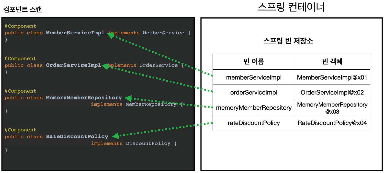 컴포넌트 스캔은 이름 그대로 `@Component` 애노테이션이 붙은 클래스를 스캔해서 스프링 빈으로 등록한다.
