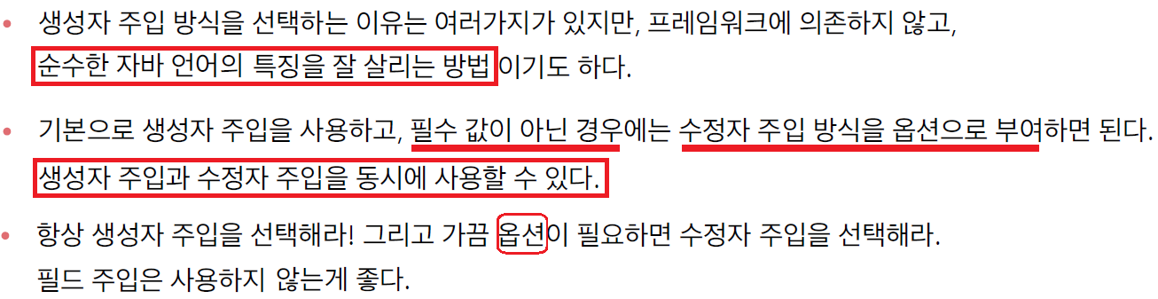 과거에는 수정자 주입과 필드 주입을 많이 사용했지만,