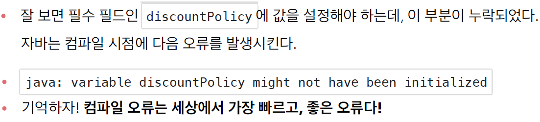 - 그래서 생성자에서 혹시라도 값이 설정되지 않는 오류를 컴파일 시점에 막아준다. 다음 코드를 보자.