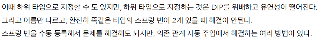 스프링 빈 조회에서 학습했듯이 타입으로 조회하면 선택된 빈이 2개 이상일 때 문제가 발생한다.
