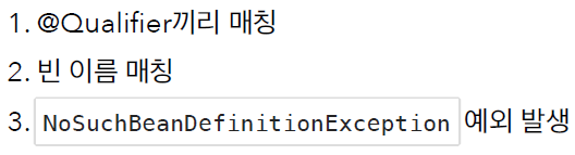 2. @Qualifier => @Qualifier끼리 매칭 => 빈 이름 매칭