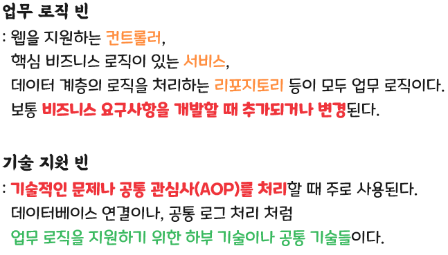 애플리케이션은 크게 업무 로직과 기술 지원 로직으로 나눌 수 있다.