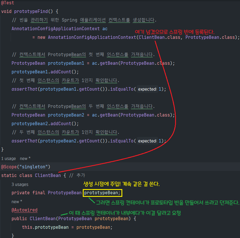 이번에는 clientBean 이라는 싱글톤 빈이 의존관계 주입을 통해서 프로토타입 빈을 주입받아서 사용하는 예를 보자.