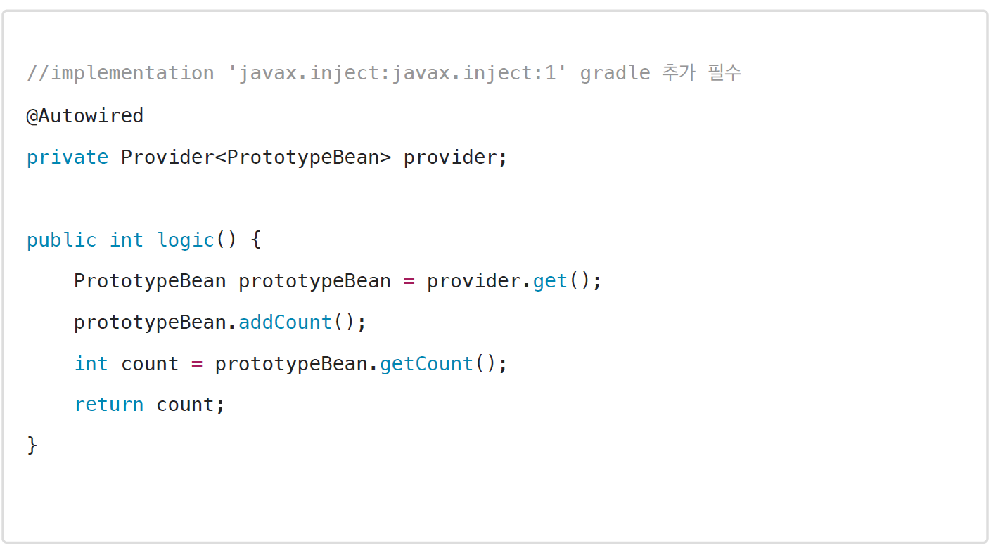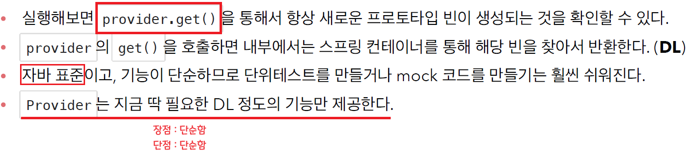 - 마지막 방법은 javax.inject.Provider 라는 JSR-330 자바 표준을 사용하는 방법이다.