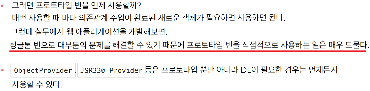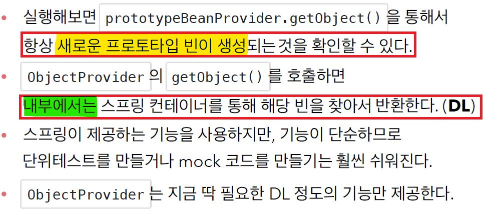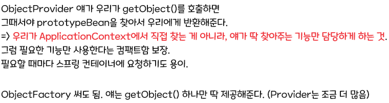 PrototypeBean prototypeBean = prototypeBeanProvider.getObject(); // 꺼내옴