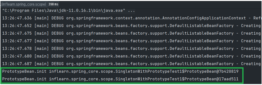 - 프로토타입 빈이 2개 생성됨을 확인할 수 있음.