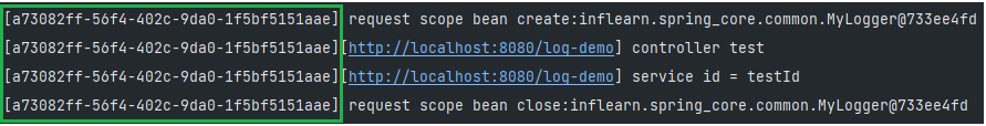 org.springframework.beans.factory.UnsatisfiedDependencyException: Error creating bean with name 'logDemoService' defined in file [C:\Inflearn_Spring\spring_core\out\production\classes\inflearn\spring_core\logdemo\LogDemoService.class]: Unsatisfied dependency expressed through constructor parameter 0; nested exception is org.springframework.beans.factory.support.ScopeNotActiveException: Error creating bean with name 'myLogger': Scope 'request' is not active for the current thread; consider defining a scoped proxy for this bean if you intend to refer to it from a singleton; nested exception is java.lang.IllegalStateException: No thread-bound request found: Are you referring to request attributes outside of an actual web request, or processing a request outside of the originally receiving thread? If you are actually operating within a web request and still receive this message, your code is probably running outside of DispatcherServlet: In this case, use RequestContextListener or RequestContextFilter to expose the current request.