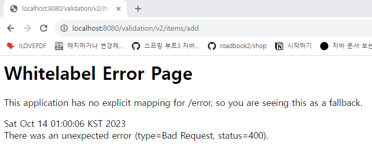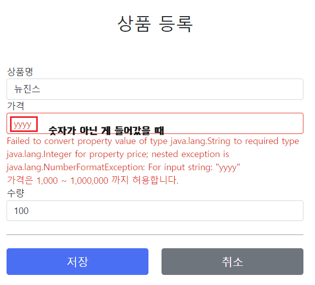 Field error in object 'item' on field 'price': rejected value [yyyy]; codes [typeMismatch.item.price,typeMismatch.price,typeMismatch.java.lang.Integer,typeMismatch]; arguments [org.springframework.context.support.DefaultMessageSourceResolvable: codes [item.price,price]; arguments []; default message [price]]; default message [Failed to convert property value of type 'java.lang.String' to required type 'java.lang.Integer' for property 'price'; nested exception is java.lang.NumberFormatException: For input string: "yyyy"]