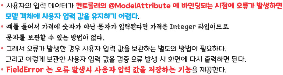 - 사용자 입력 오류 메시지가 화면에 남도록 하자. 예) 가격을 1000원 미만으로 설정시 입력한 값이 남아있어야 한다.