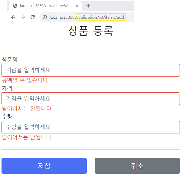 -> 실행해보면 애노테이션 기반의 Bean Validation이 정상 동작하는 것을 확인할 수 있다.