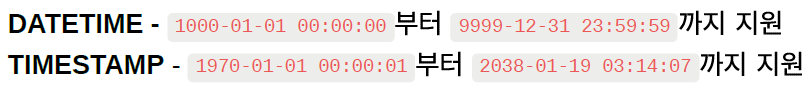 | TIMESTAMP | ○ 날짜와 시간 형태의 기간 표현 데이터 ○ 타입 시스템 변경 시 자동으로 그 날짜와 시간이 저장 |