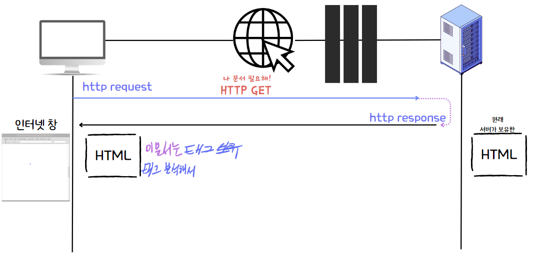 - 서버는 서버에 위치한 리소스를 찾아서 response를 보내준다. 그러면 클라이언트는 HTML을 수신한다.