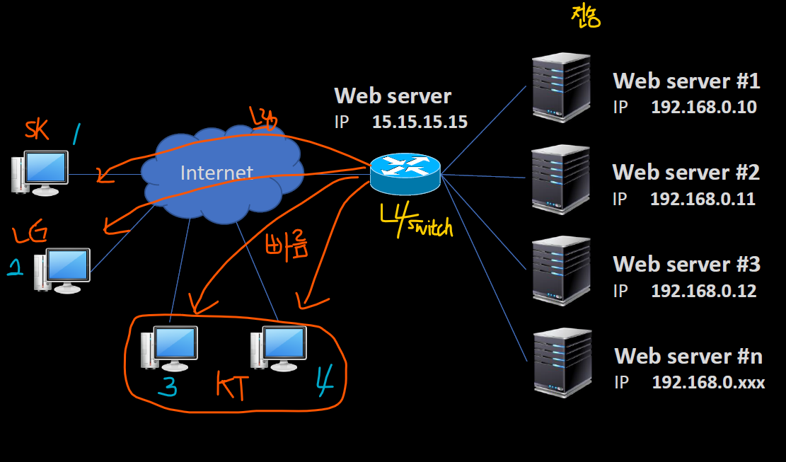 웹서버들은 온프레미스 환경에서 직접 서비스를 한다고 하면 그림에 있는 부분에 L4 스위치를 달아서 부하 분산을 하게 만드는 방법이 있다.