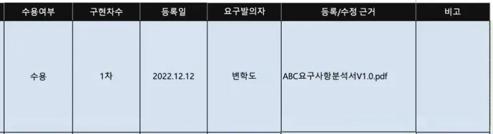 >> 이때 요구사항 발의자, 날짜, 출처를 기록하고, PM을 통해 수용 여부를 결정한다.