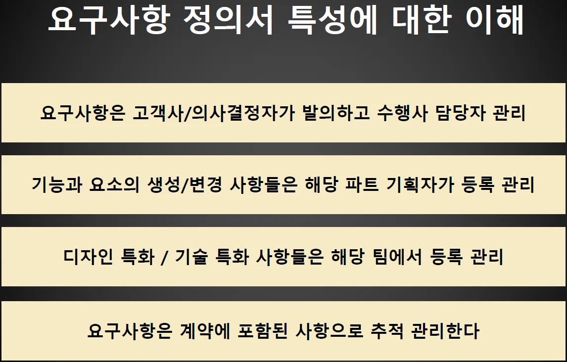 - ex. 클라이언트가 밤 11시에 전화로 "이거 좀 처리해주세요"라고 요청했을 때, 이는 요구사항이 될 수 있지만, 반드시 문서로 정리되어야 함