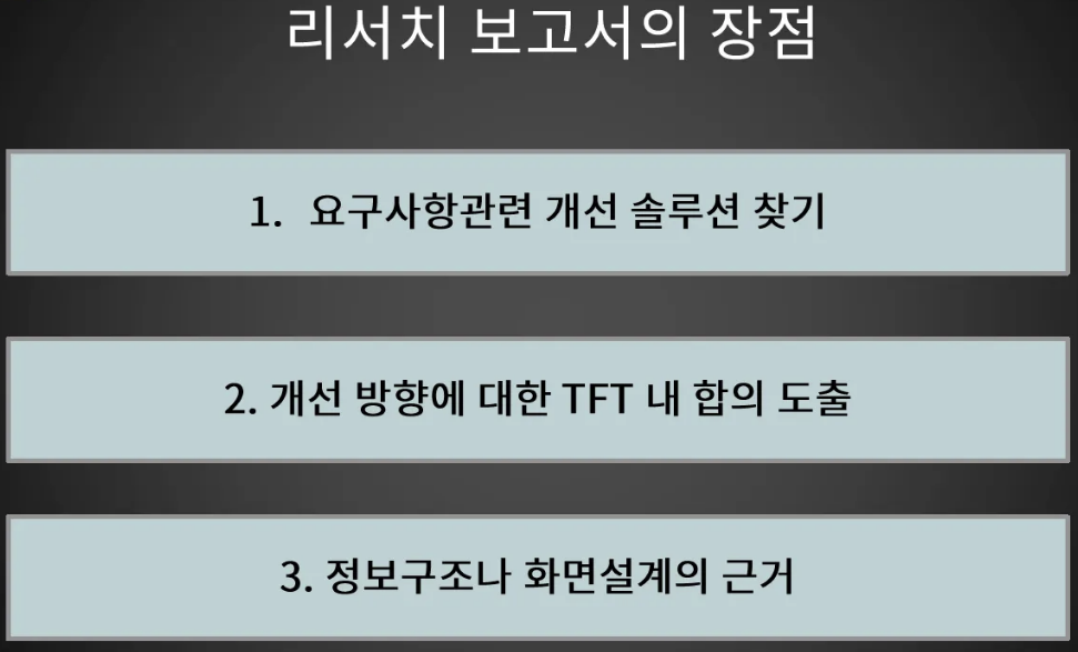 - 화면 설계서를 작성할 때쯤에 의견합의가 어렵거나 당황스러운 내색을 하는 경우가 생길 수 있는데, 이 경우 어떻게 바꾸겠다는 리서치 리포트 샘플 하나만 내가 한번 미리 보여줬으면 화면 설계서를 가져왔을 때 훨씬 부드럽게 된다.
