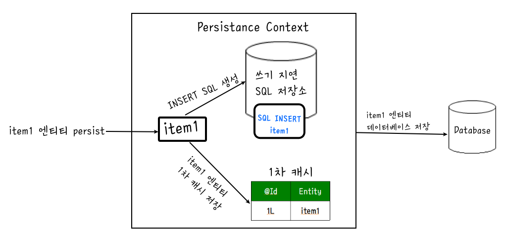- entityManager.persist() 를 호출하면 1차 캐시에 저장되는 것과 동시에 쓰기 지연 저장소에 SQL 문이 저장된다.