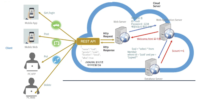 - API 통해 데이터를 JSON 또는 XML 형식으로 주고받음