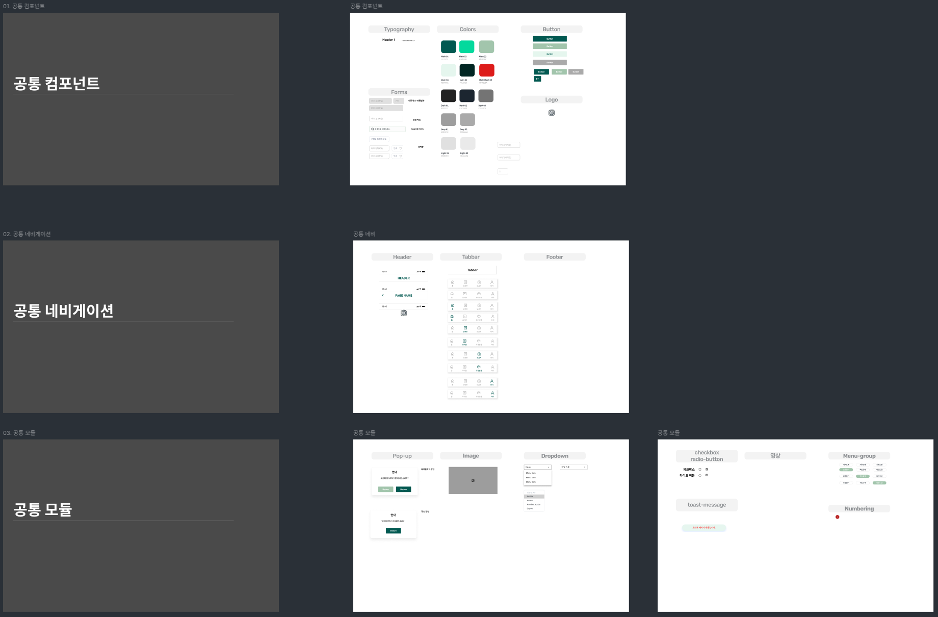 - 예전에는 PPT에서 공통영역을 따로 정의해놓고, 본문에서는 그걸 계속 복붙해서 쓰는 방식이는데, 피그마에서는 공통 프레임(컴포넌트)을 만들어 놓고 그걸 재활용할 수 있다.