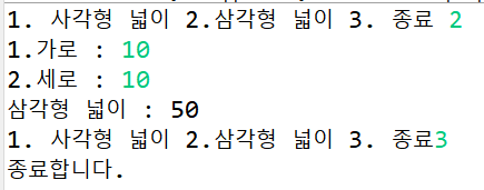System.out.print("1. 사각형 넓이 2.삼각형 넓이 3. 종료");