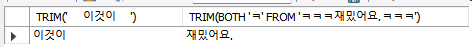SELECT TRIM(' 이것이 '), TRIM(BOTH 'ㅋ' FROM 'ㅋㅋㅋ재밌어요.ㅋㅋㅋ');