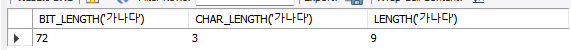 SELECT BIT_LENGTH('가나다'), CHAR_LENGTH('가나다'), LENGTH('가나다');