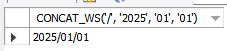 SELECT CONCAT_WS('/', '2025', '01', '01'); -- 2025/01/01